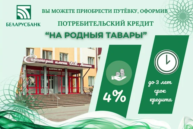 Теперь можно получить кредит по льготной ставке (всего 4% годовых) от ОАО «Беларусбанк» на потребительские нужды для приобретения путевок на санаторно-куротное лечение в организациях, находящихся на территории Республики Беларусь, осуществляющих санаторно-курортное лечение населения и имеющих действующее свидетельство о государственной аттестации. Подробности читайте на сайте belarusbank.by