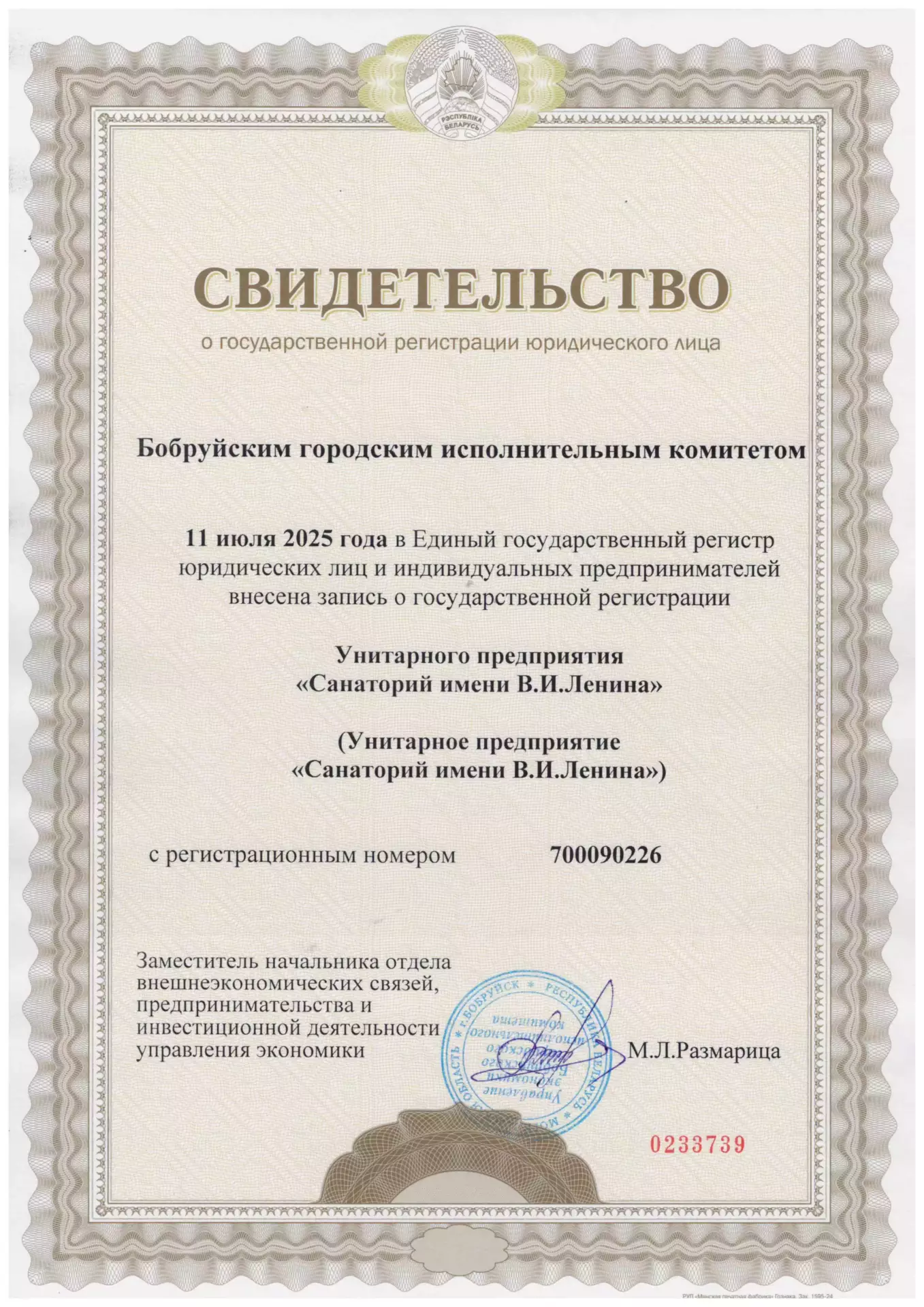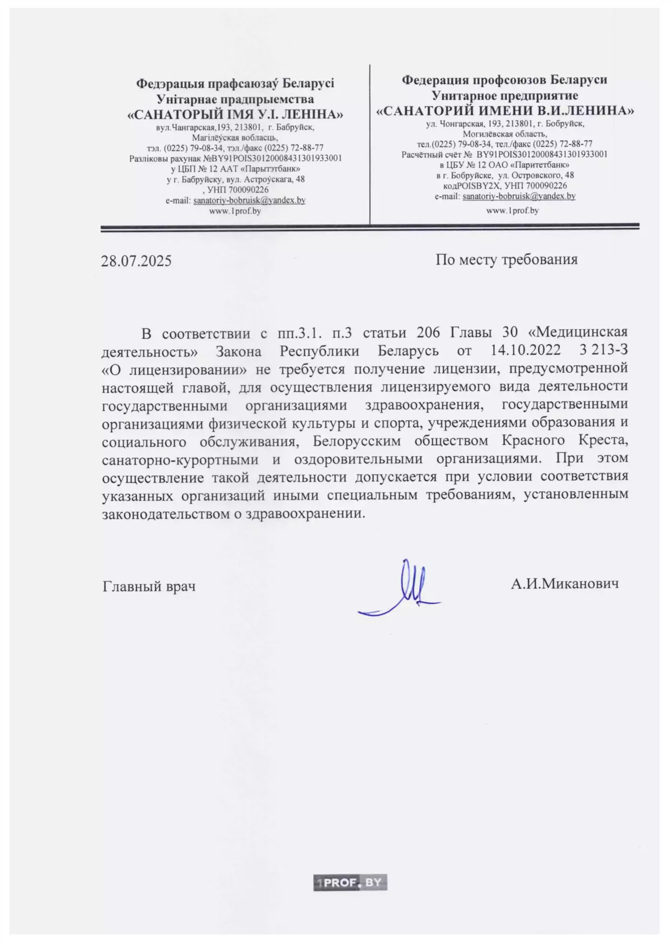 Исполнитель – Унитарное предприятие “Санаторий имени В.И. Ленина” (сокращенное наименование – Унитарное предприятие “Санаторий имени В.И. Ленина”), зарегистрированное решением Бобруйского городского исполнительного комитета от 18 марта 2014 года в Едином государственном регистре юридических лиц и индивидуальных предпринимателей за № 700090226, специальное разрешение (лицензия) на право осуществления медицинской деятельности № 02040/724 от 27.12.1999 года (действительна до 27.12.2024 г.), юридический/почтовый адрес: Республика Беларусь, г. Бобруйск, ул. Чонгарская, 193, официальный сайт – www.санаторийленина.бел.
